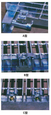 B型:由一塊帶雙鉤的上壓板(其中一個(gè)鉤可將相鄰的兩塊鋼格板括在一起),一塊帶齒的下壓板和一支