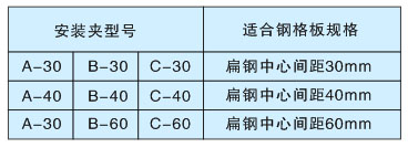 鋼格板的安裝固定可用焊接和安裝夾兩種方法。對(duì)永久性不需拆卸,可采用焊接,將其焊在支撐物上。具體位置,在板的每個(gè)角第一根扁鋼上,焊接長不小于20毫米,高不小于3毫米的角焊。采用安裝夾具有不破壞鋅層和拆卸方便的優(yōu)點(diǎn),可使用茂源牌安裝夾固定,每塊板至少應(yīng)采用四個(gè)安裝夾,對(duì)較大的板塊最好在可利用的支撐物上多安裝幾個(gè)。 具體選用見表: